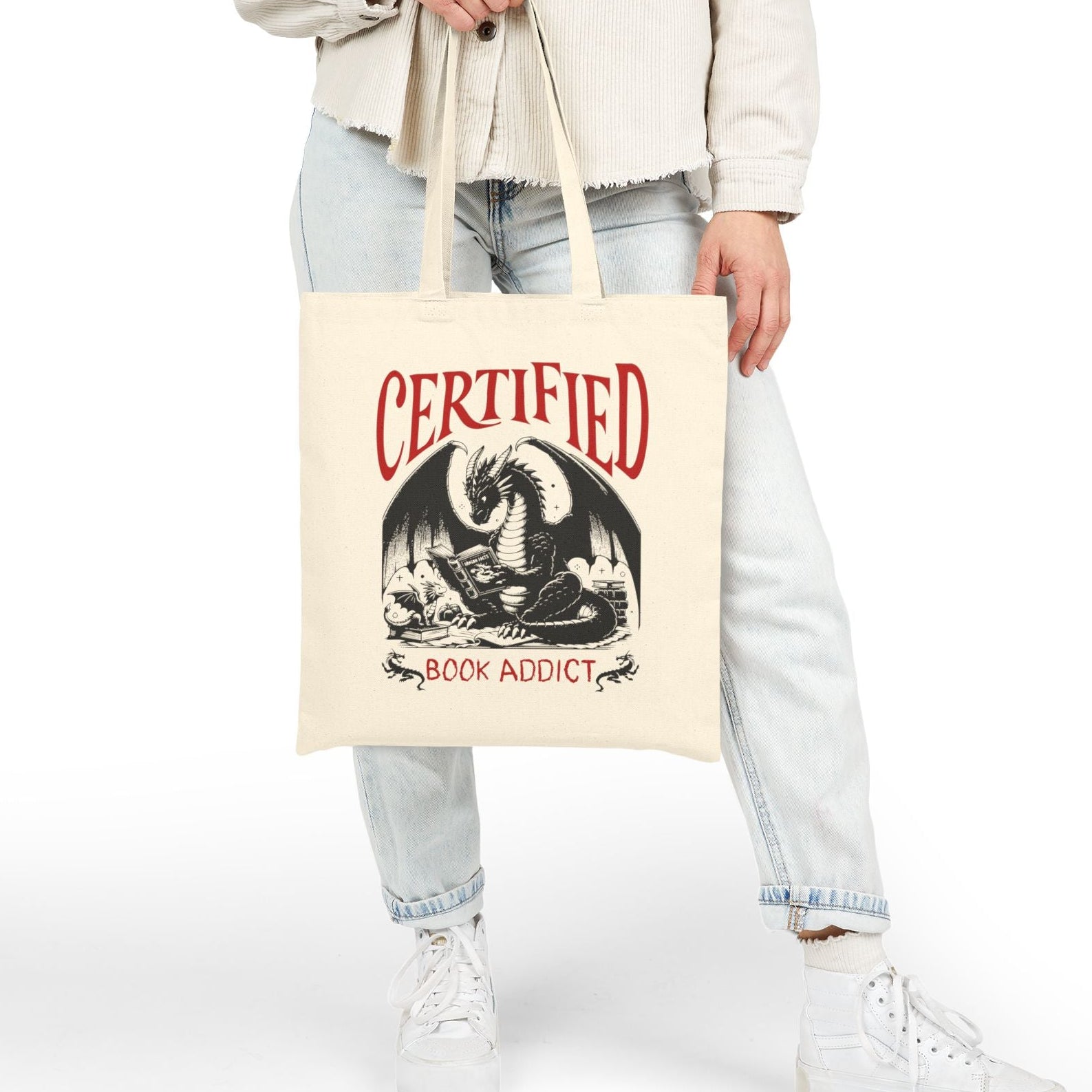 Certified Book Addict Tote Bag — Dragon Reading Canvas Tote, Book Lover Gift, School Bag for Fantasy Fan