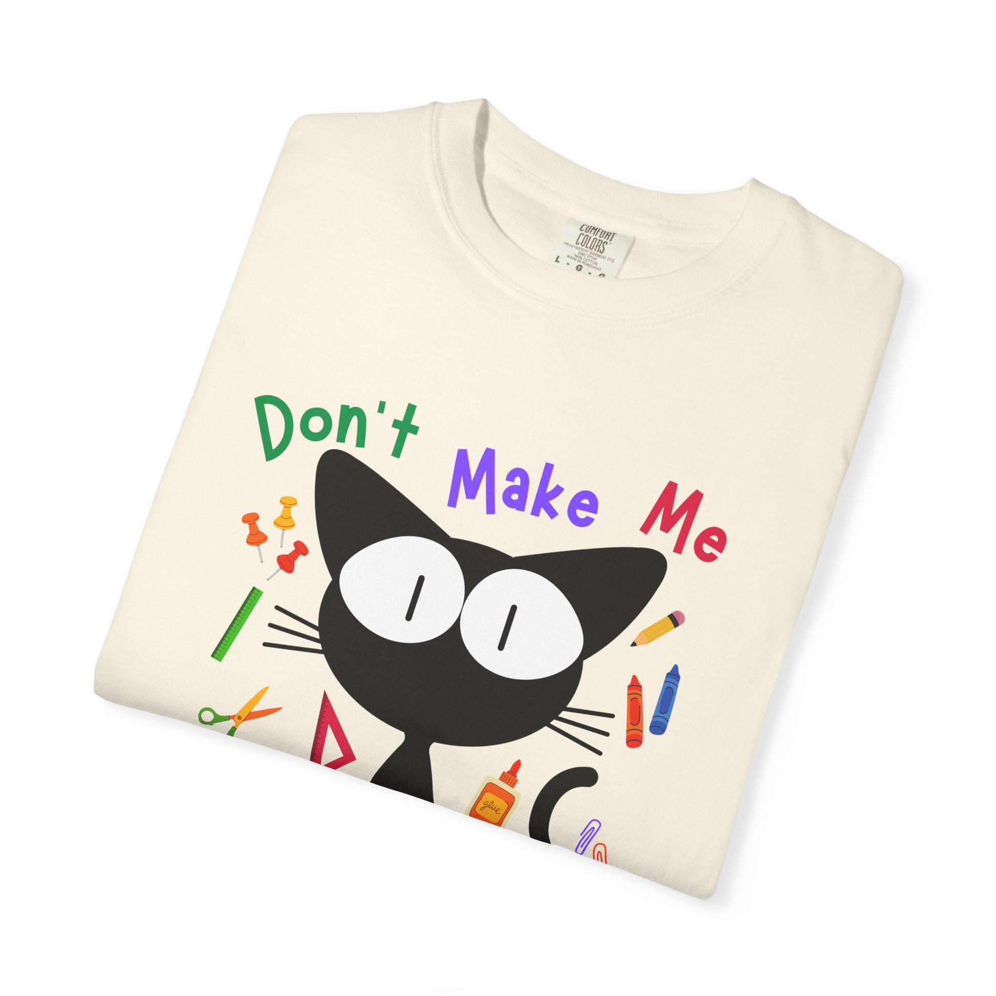 Bring a little humor to the classroom with this adorable teacher tee featuring a wide-eyed cat surrounded by school supplies and the hilarious warning: “Don’t Make Me Use My Teacher Voice.” Perfect for elementary teachers who know that sometimes the quiet voice just doesn’t work. The cute design blends playful classroom graphics—pencils, rulers, notebooks, and apples—with a slightly dramatic kitty who clearly means business.