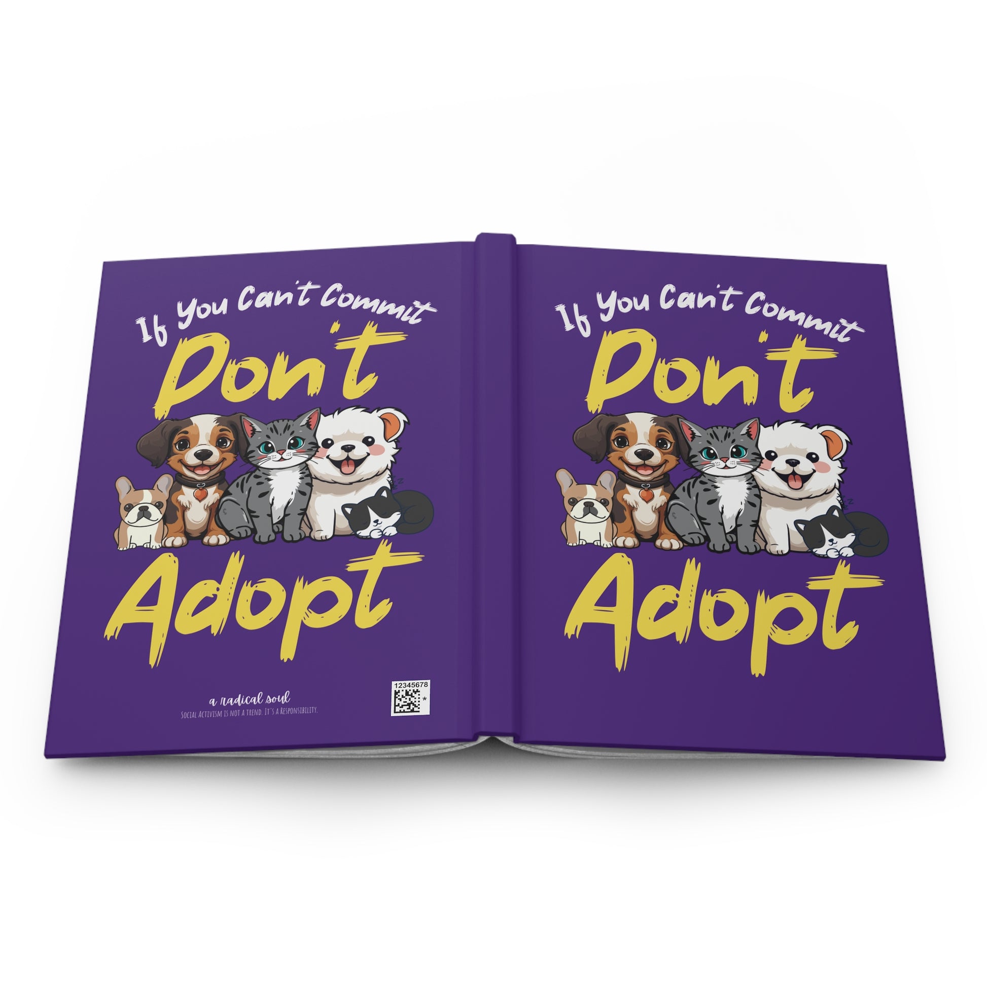 This blank, lined notebook provides a daily companion for animal lovers and rescue advocates. The bold purple background and cheerful illustrated pets carry a clear, heartfelt message: If you can’t commit, don’t adopt. Inside, 150 lined pages (75 sheets) with perforations let ideas, lists, or adoption resources be shared and removed with ease.