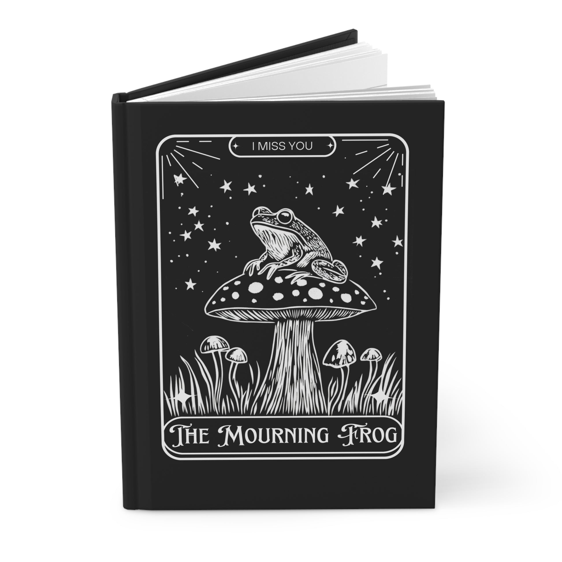 A sweet sympathy gift, this hardcover journal feels like a quiet companion on late-night thoughts. The black cover features a white ink-style illustration of a frog perched on a spotted mushroom beneath a sky of stars, framed like an old tarot card with the words “I miss you” and “The Mourning Frog.” It opens flat thanks to casewrap binding and offers 150 lined pages with perforations for easy removal. The matte laminated finish and full wraparound print give the art a meaningful presence you’ll return to for notes, sketches, and memory-keeping.