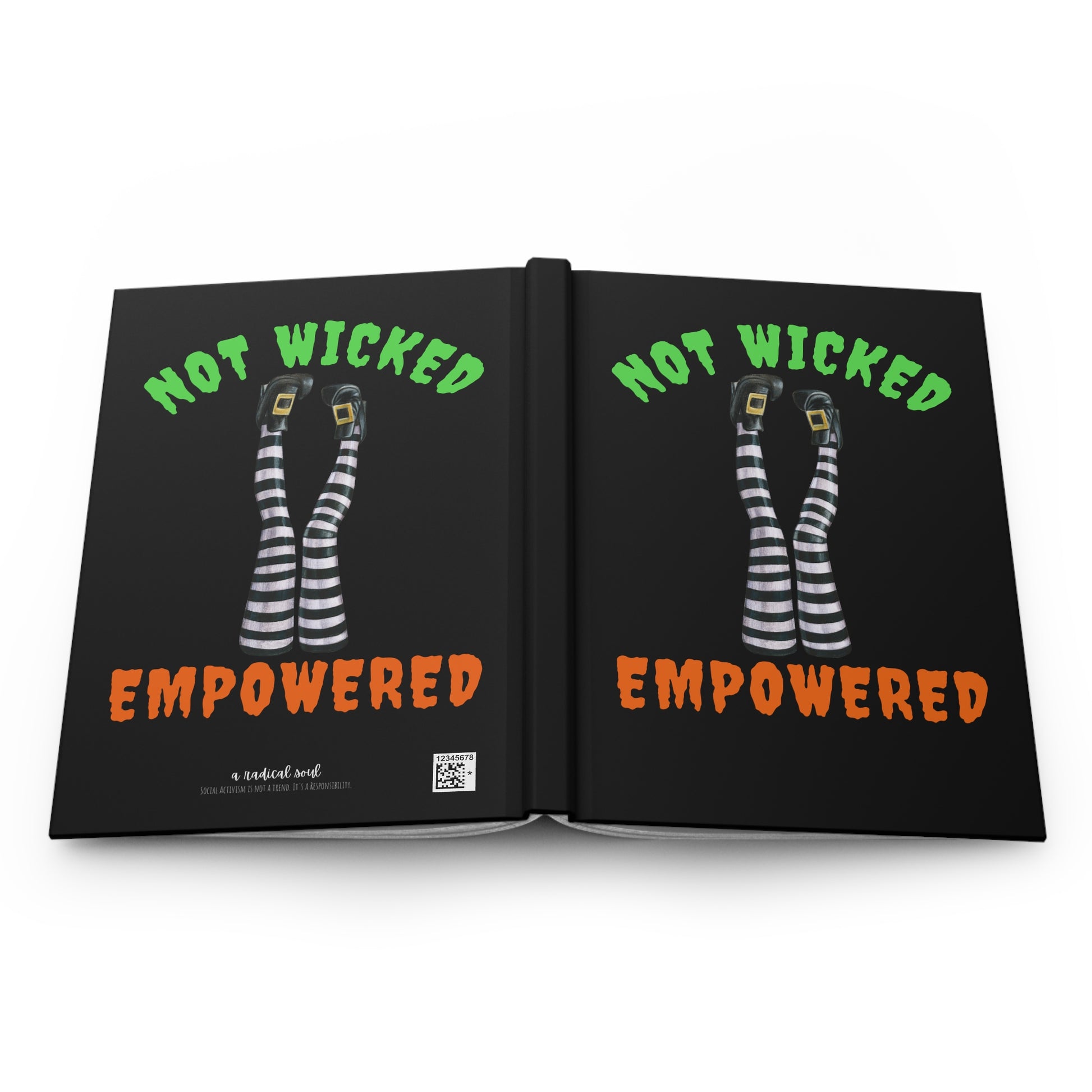 Female empowerment journal with a witchy vibe. Unleash your magic with this Not Wicked, Empowered notebook—a celebration of strong, confident women everywhere. The cover features fun witches’ legs in iconic striped stockings, turning a classic Halloween symbol into a declaration of strength. Inside, crisp lined pages offer space for journaling, note-taking, planning, spell-crafting, or dreaming big.