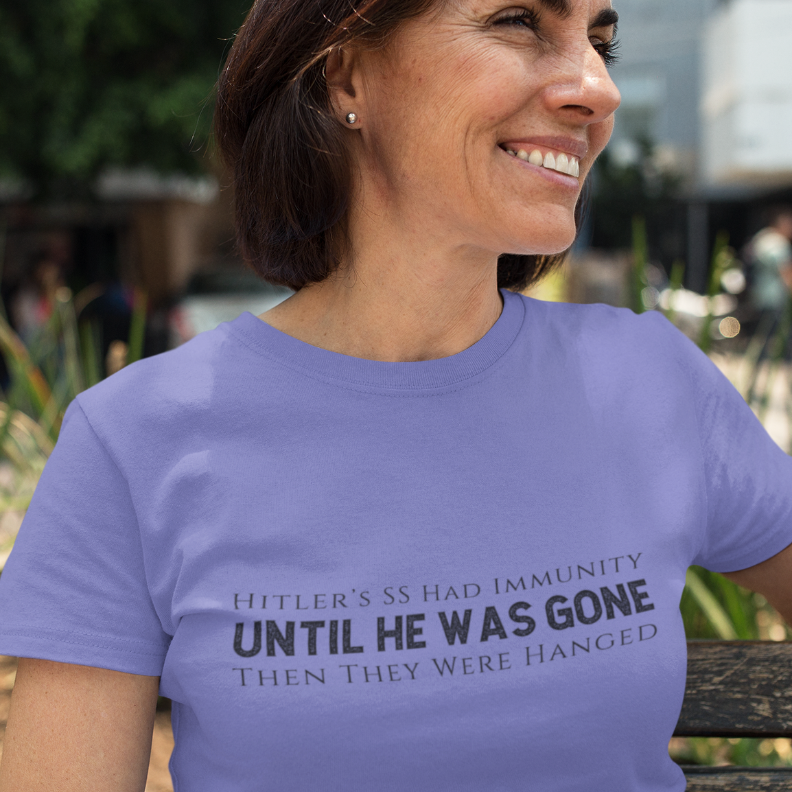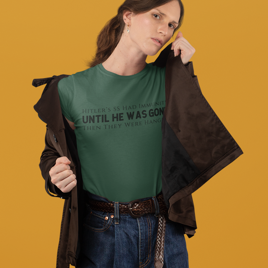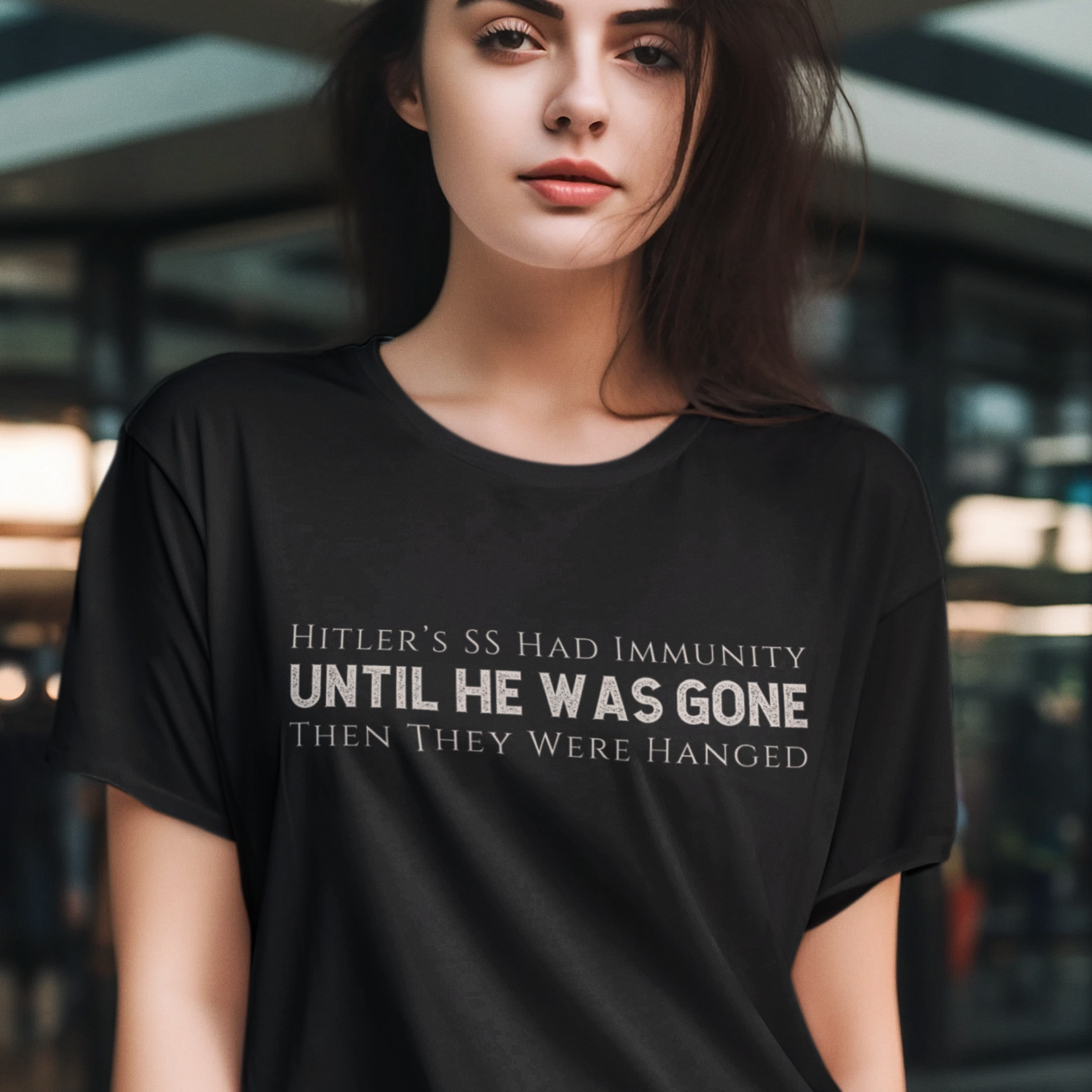 This t-shirt is a blunt historical comparison meant to provoke thought, not violence. It challenges the normalization of militarized enforcement, mass detention, and fear-based tactics by pointing to where those paths have led before. Wearing it is a refusal to look away—and a demand for transparency, human rights, and the rule of law.