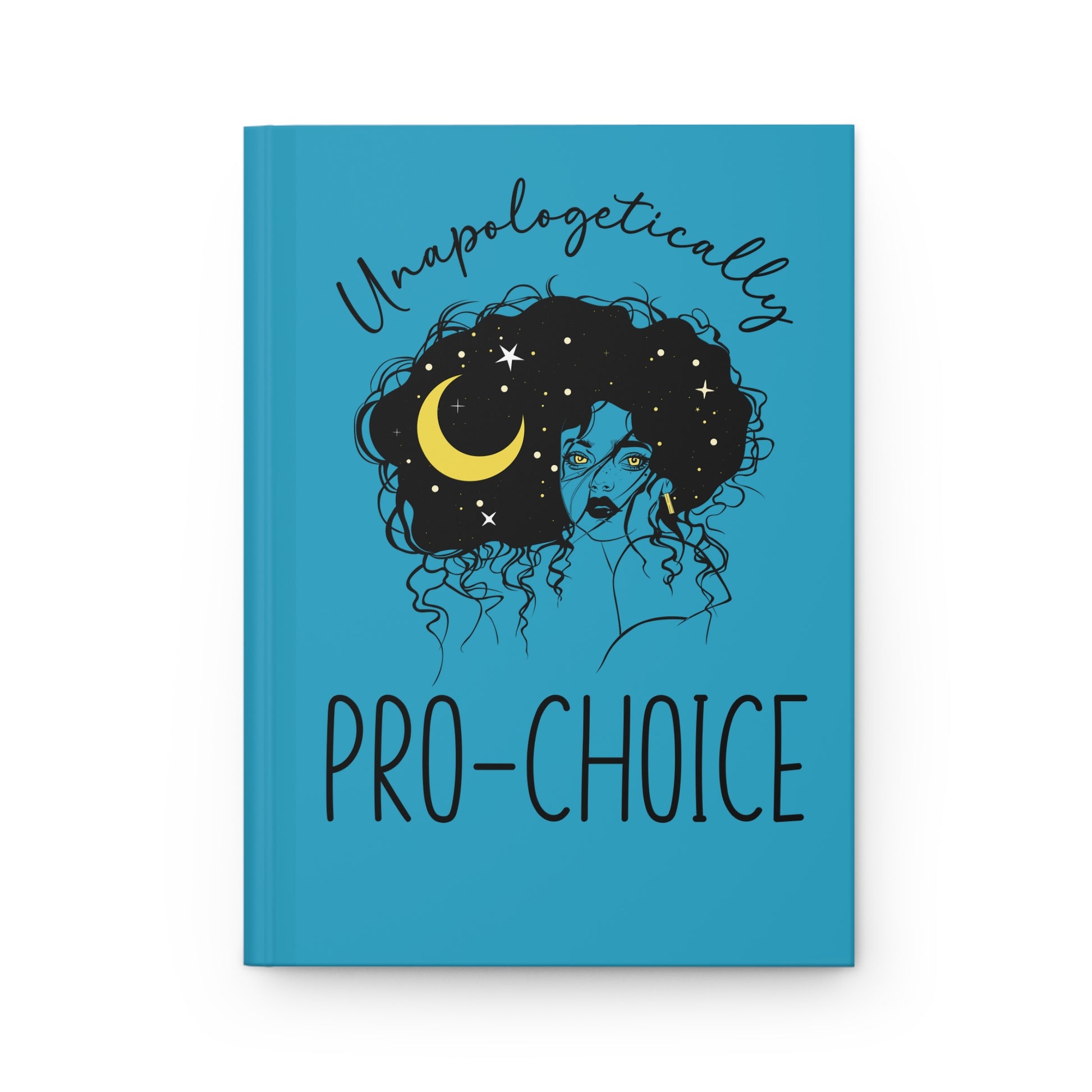 Pro-choice, pro women blank lined journal. This hardcover teal notebook holds bold beliefs and private thoughts alike. The design features a striking illustration of a cosmic-haired woman beneath a crescent moon, with the message “Unapologetically PRO-CHOICE.” It provides a safe, confident space to sketch plans, track emotions, or draft protest signs—compact enough to carry to rallies, coffee shops, or bedside desks.