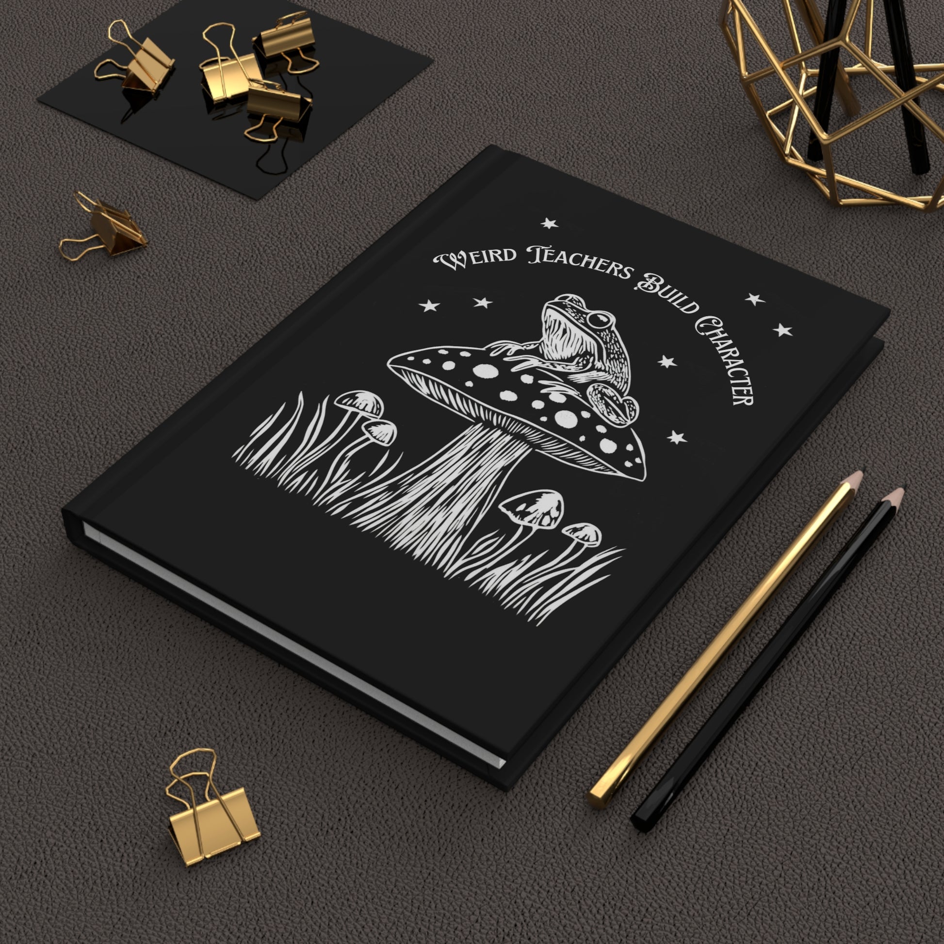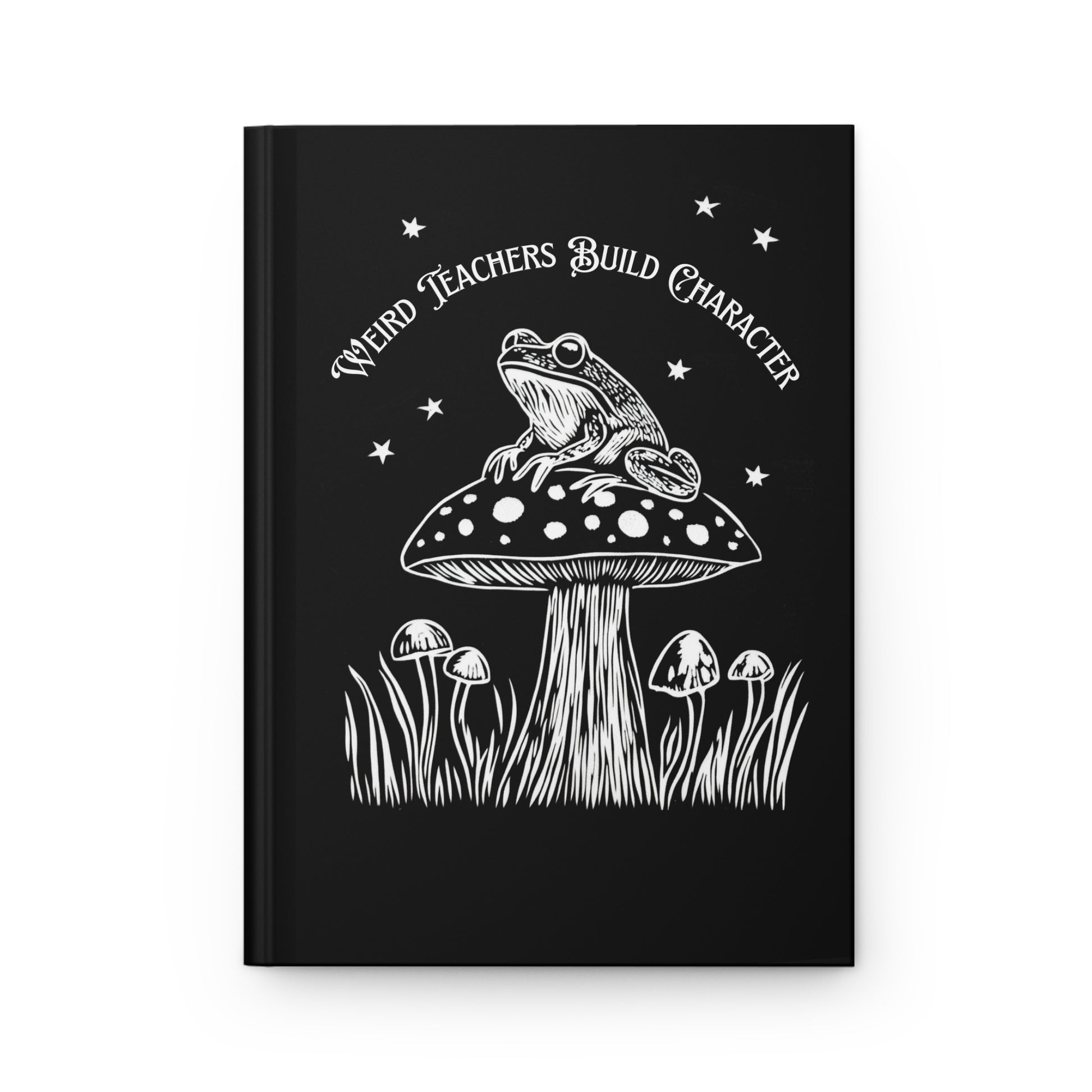 Playful Teacher's Notebook with a cute frog theme. Black matte hardcover journal with an artful white-ink illustration: a frog perched on a spotted mushroom beneath a scatter of stars, framed by sprays of grass. The design reads “Weird Teachers Build Character,” giving this journal a playful, frogcore vibe that nods to classroom rebels and devoted educators with a sense of humor.
