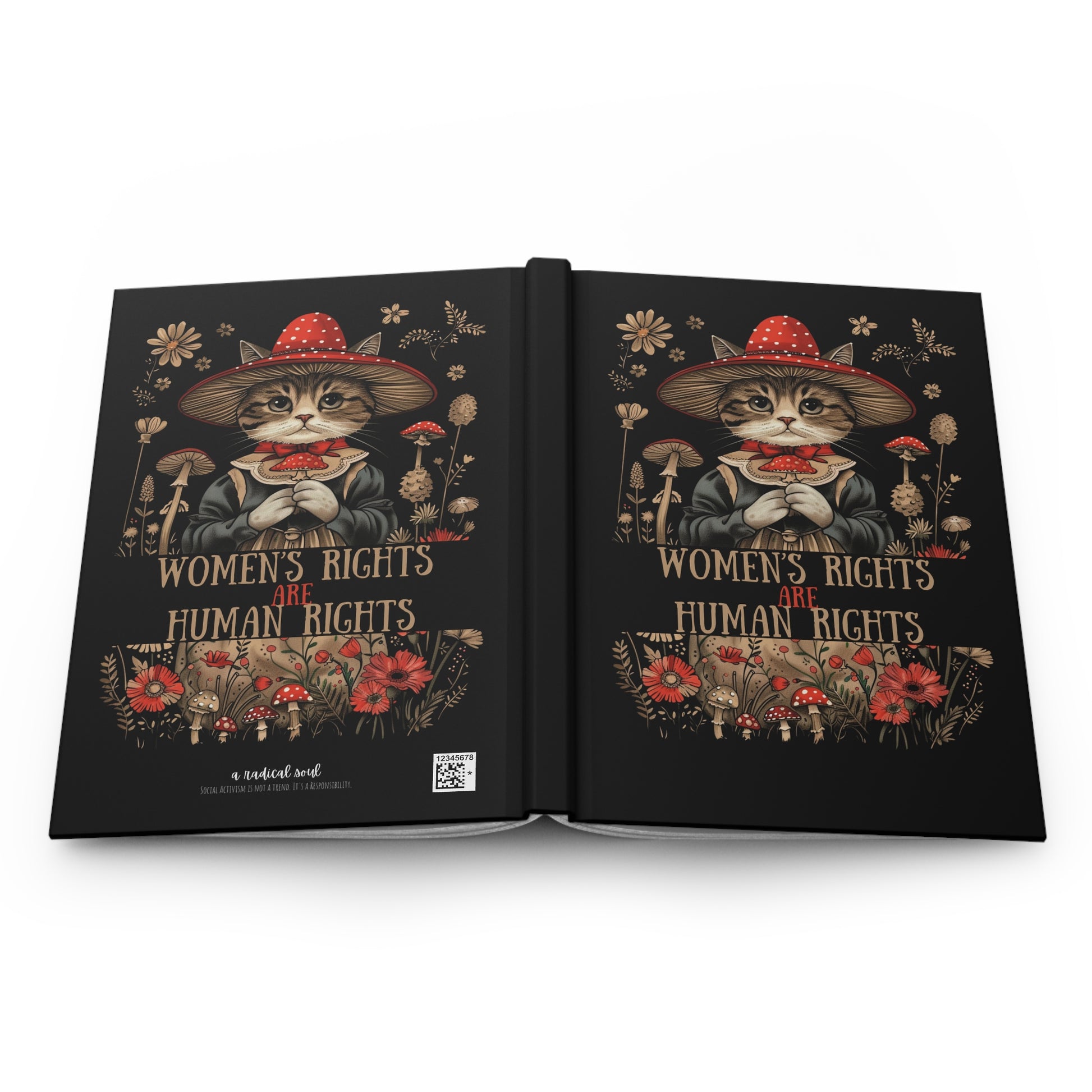 Women's Rights Notebook. Tender whimsy with quiet conviction. The cover art—an earnest kitten in a mushroom hat surrounded by wildflowers and toadstools—frames the message “Women’s Rights Are Human Rights” with vintage-inspired colors and fine detail. This is a notebook you’ll reach for when you want something that makes a statement, and is both gentle and resolute to capture ideas, plans, and reflections.